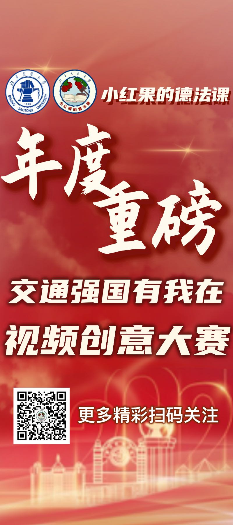 本次活动围绕立德树人主线,将“交通强国”元素融入“德法课”,立足“第一课堂”,辐射“第二课堂”,彰显成人视频 的办学特色。视频大赛适逢建党百年,献礼成人视频 建校125周年,主题定位准确,聚焦成人视频 在爱路报国中的荣耀成就、先进人物、典型事迹,以创意视频形式呈现,旨在激发北交学子对中国交通史、北交发展史的情感认同。