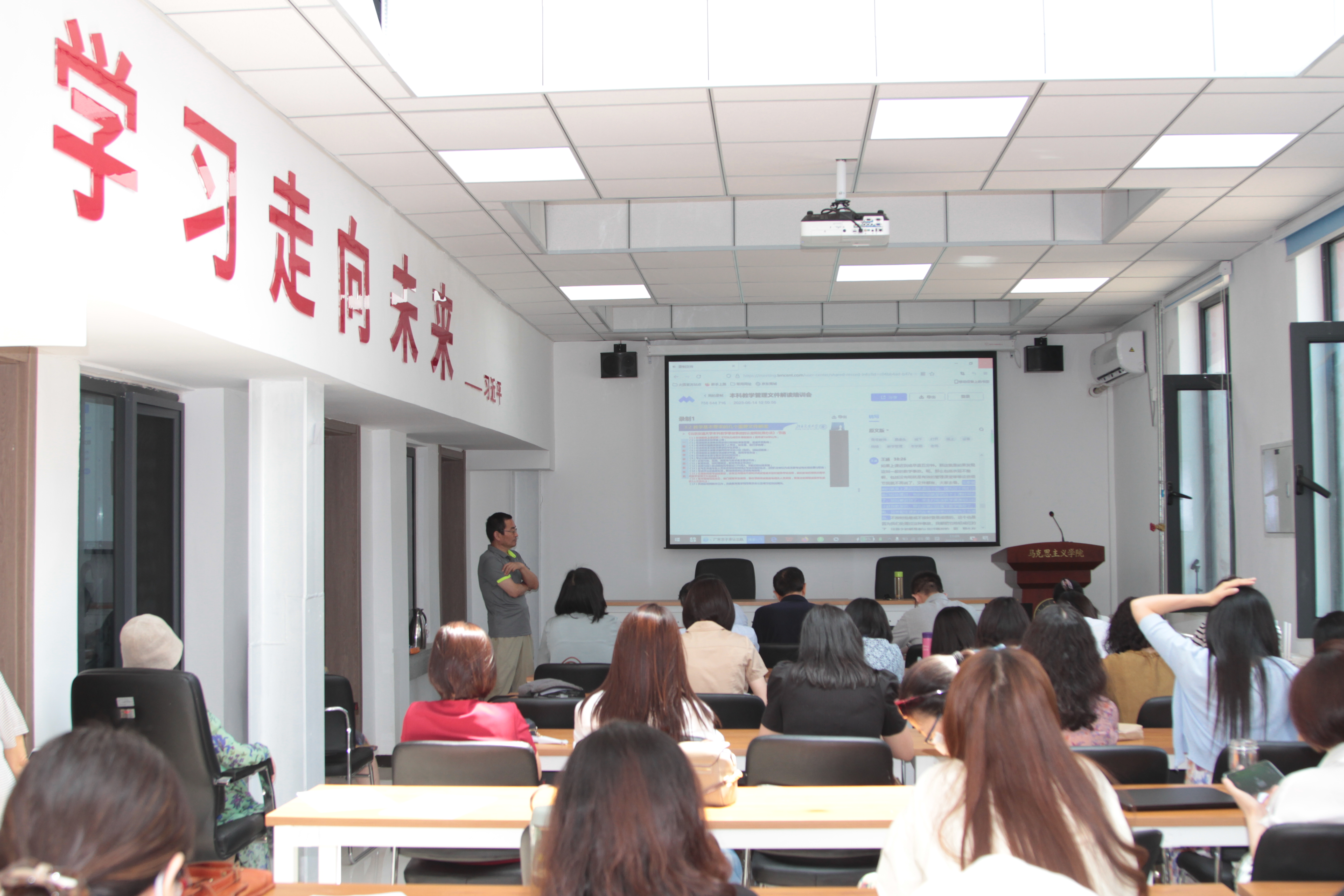 院长高正礼带领全体教师集中学习了学院编制的学习材料,其中涵盖了总书记关于教育的重要论述及教育部印发关于师德师风方面的重要文件,使全体教师进一步知准则、守底线,落实好“立德树人”根本任务,共同构筑学院良好的师德师风氛围。