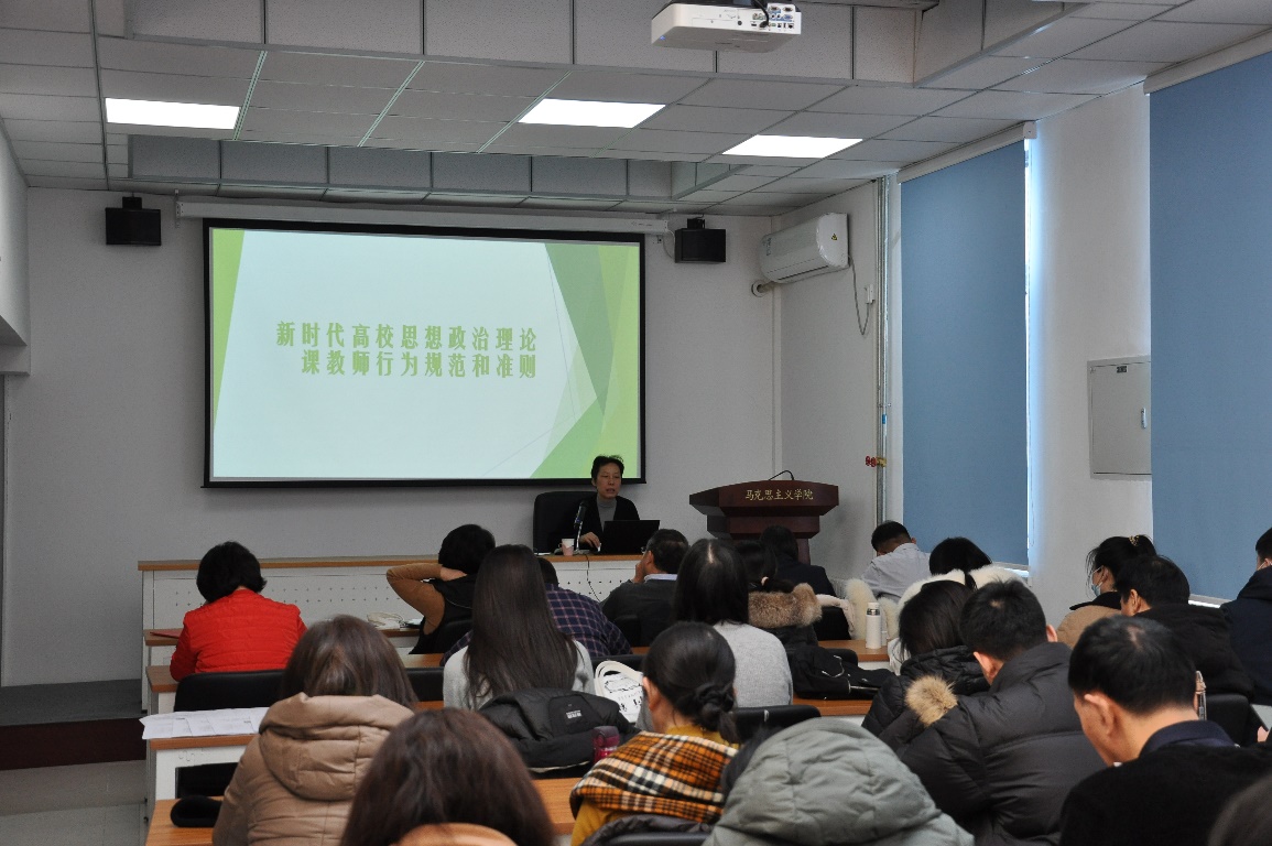 学院党委书记孙冬梅为学院教职工讲解了《新时代高校思想政治理论课教师行为规范和准则》,重点对照文件中十二条规范进行解读。孙冬梅表示马院教师要保持清醒头脑、遵规守纪;要修身立德、潜心育人,模范践行教育家精神,真正成为“经师”与“人师”相统一的“大先生”。